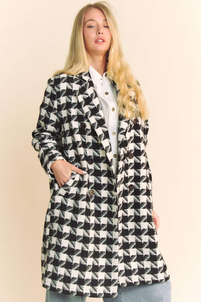 Elevated plaid long coat featuring a bold checkered pattern with a double-breasted front and tailored silhouette.