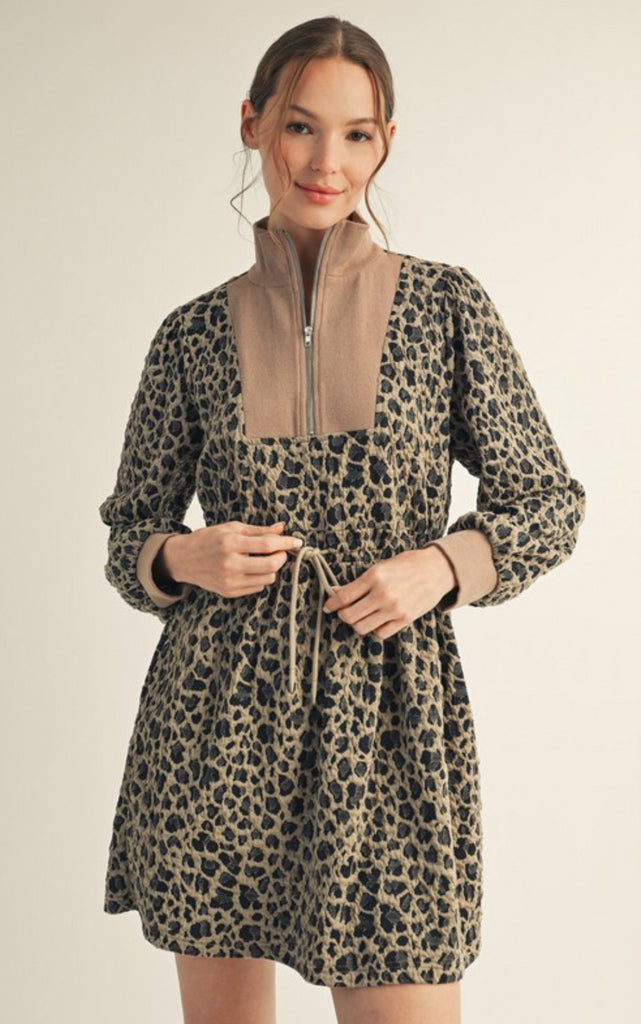 3/4 Puff Sleeves Floral Jacquard Dress w/ Ruffled Neckline