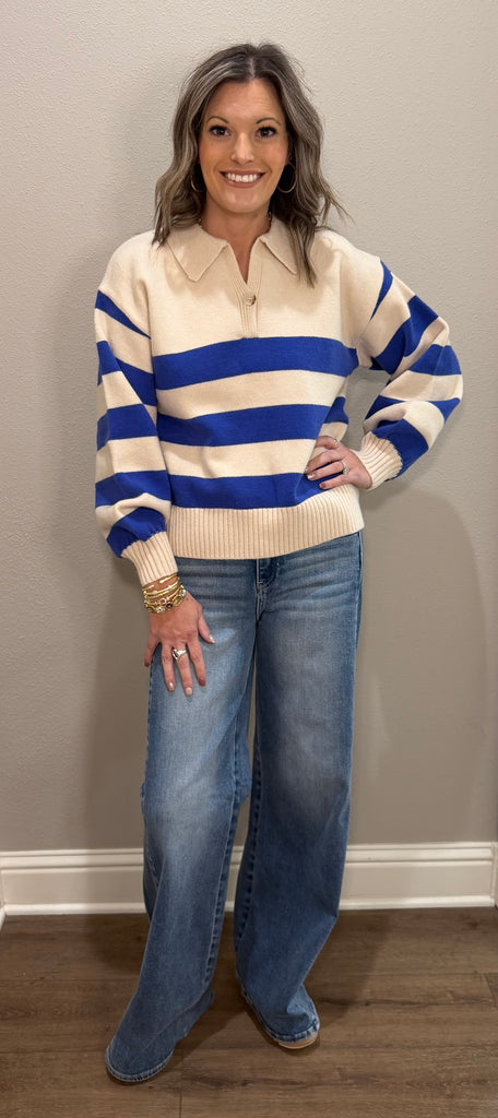 Cobalt Blue & Cream Stripe Collared Sweater Top