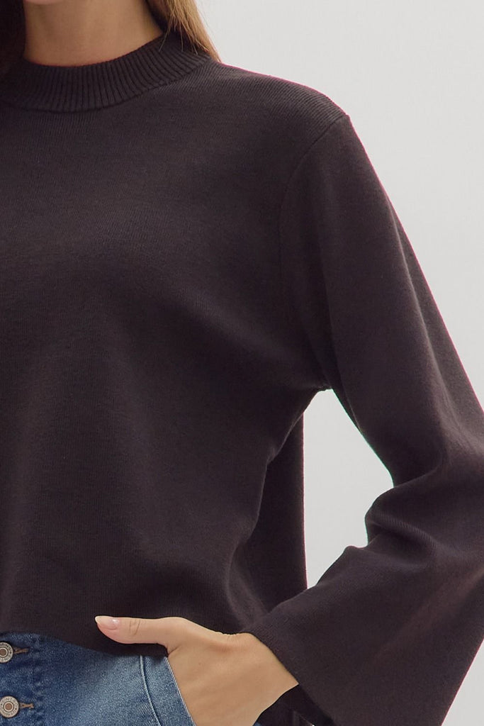 Solid long sleeve sweater knit top featuring mock neck and slit detail at sleeve openings. Unlined. Sweater knit. Non-sheer. Lightweight.