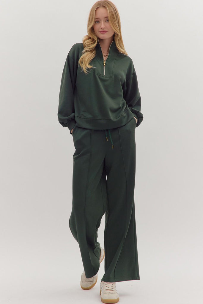 Solid wide-leg pants featuring drawstring elastic waist and front seam detail. Side pockets. Unlined. Knit. Non-sheer. Lightweight.