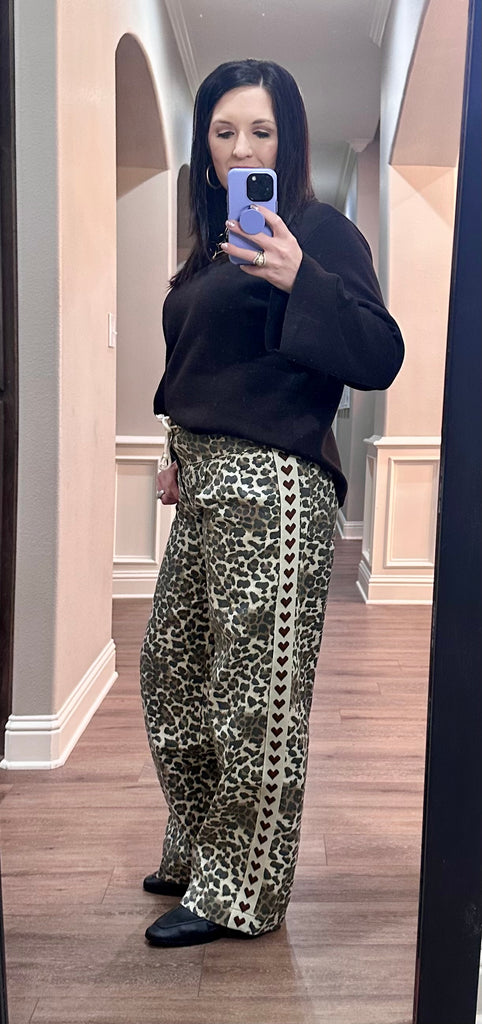 -Leopard printed -Printed Striped Details -Wide Legged Model is 5'9 wearing a size small